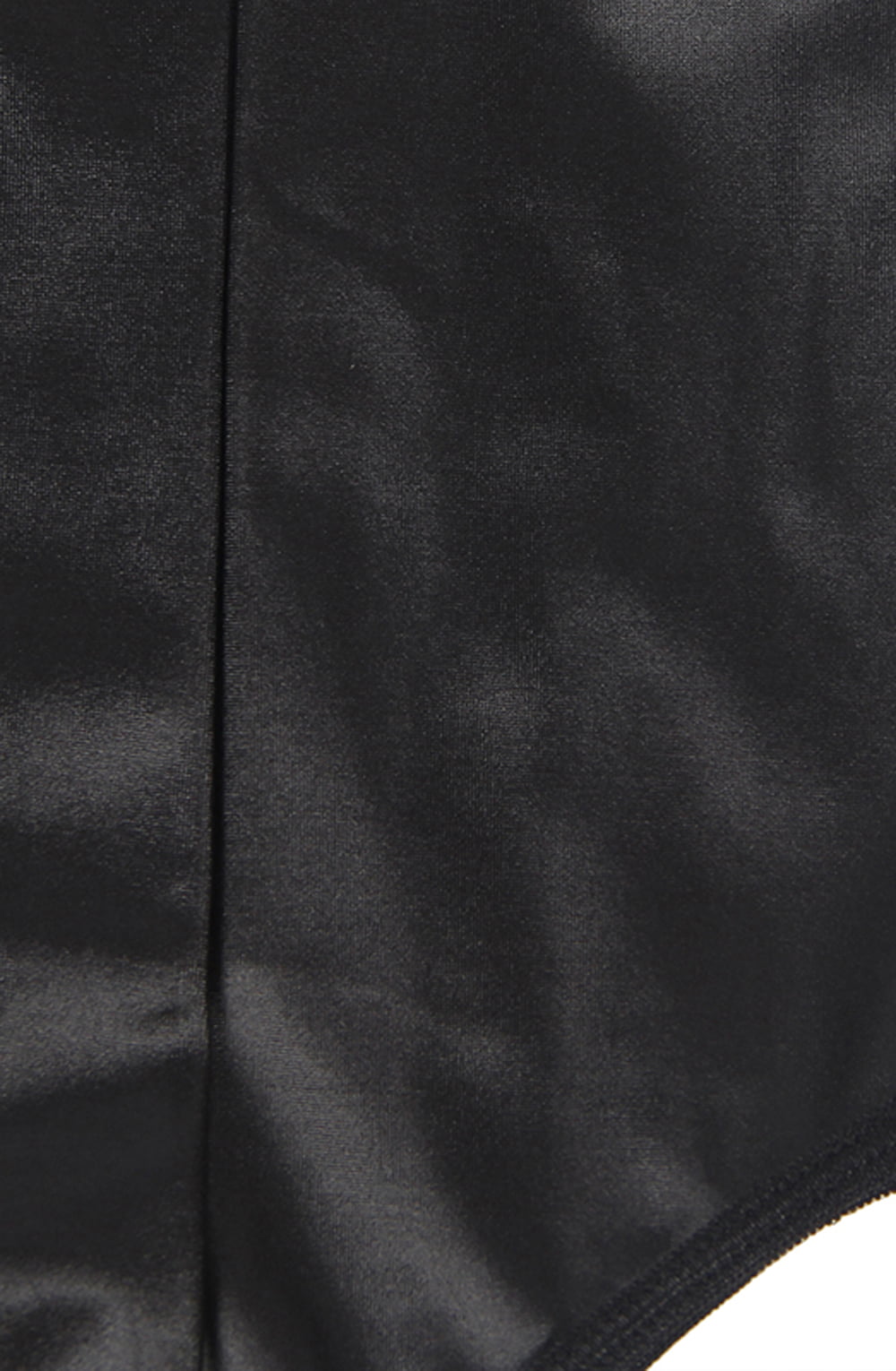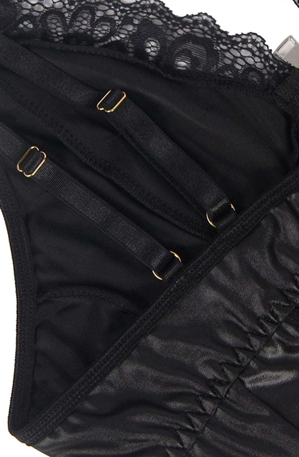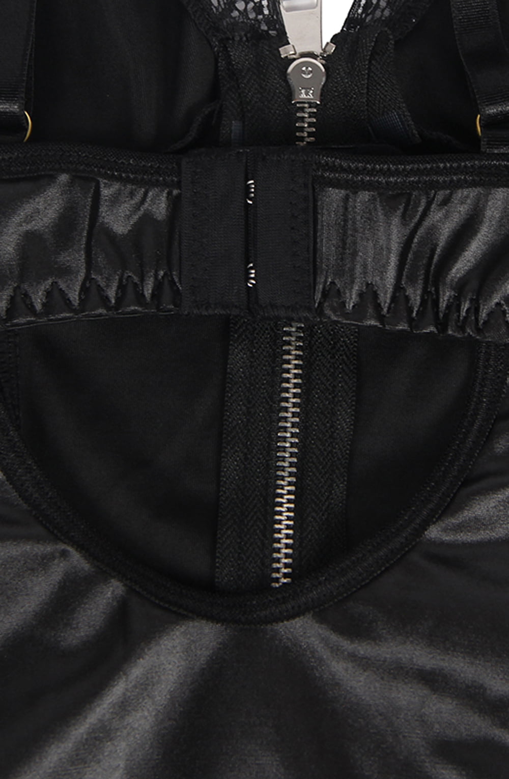A figure hugging wet look two piece set with full zip up front. Double shoulder straps with inlay lace effect bra cups. Fully adjustable bra fastening and suspender straps. A great outfit to team up with stockings (not included but available separately) or make this gorgeous set your perfect evening look by pairing it with your favourite jeans. Item arrive packaged in a Yesx satin bag.