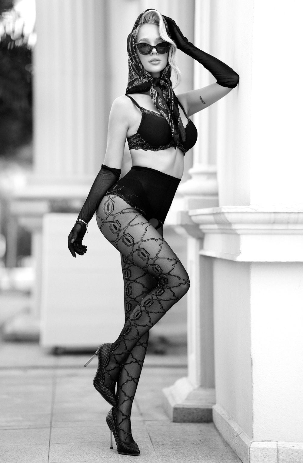 Elevate your style with these chic crotchless sheer black tights, designed to combine elegance and allure. Featuring a bold geometric pattern, they’re perfect for making a statement.