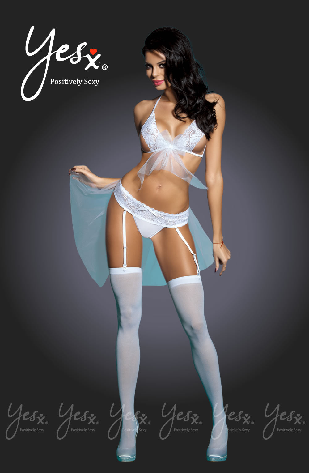 Beautiful 3 pieces lace bra with butterfly knot swallow tail garter thong and pretty matching stockings.